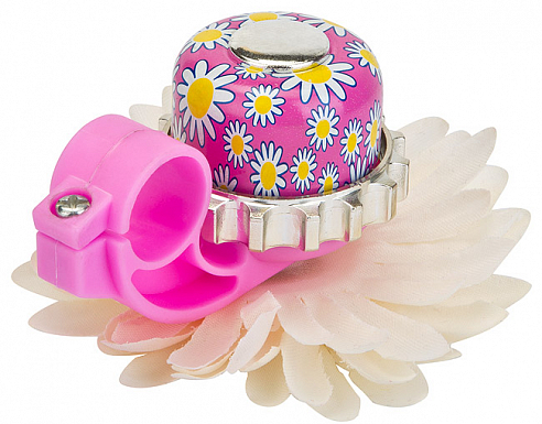 - Дизайн звонка в виде ромашки с бело-розово-фиолетовым цветовым сочетанием добавит нотку красоты и элегантности к вашему велосипеду.