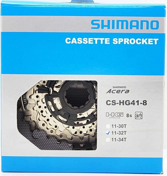 Кассета Shimano CS-HG41, 8ск, 11-32 Acera. Звезды просверлены для облегчения веса без потерь в жесткости. Кассета имеет звезды выполненные по технологии Hyperglide* и предназначена для работы с 8 скоростными цепями серии Shimano HG.